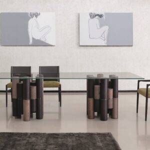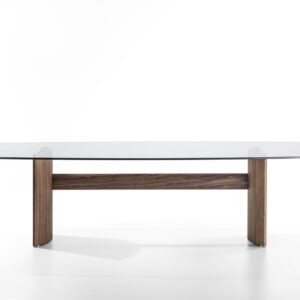 Dining-table with base in solid canaletta walnut or ash fixed on a metal disc and tempered glass top (thickness mm. 12).