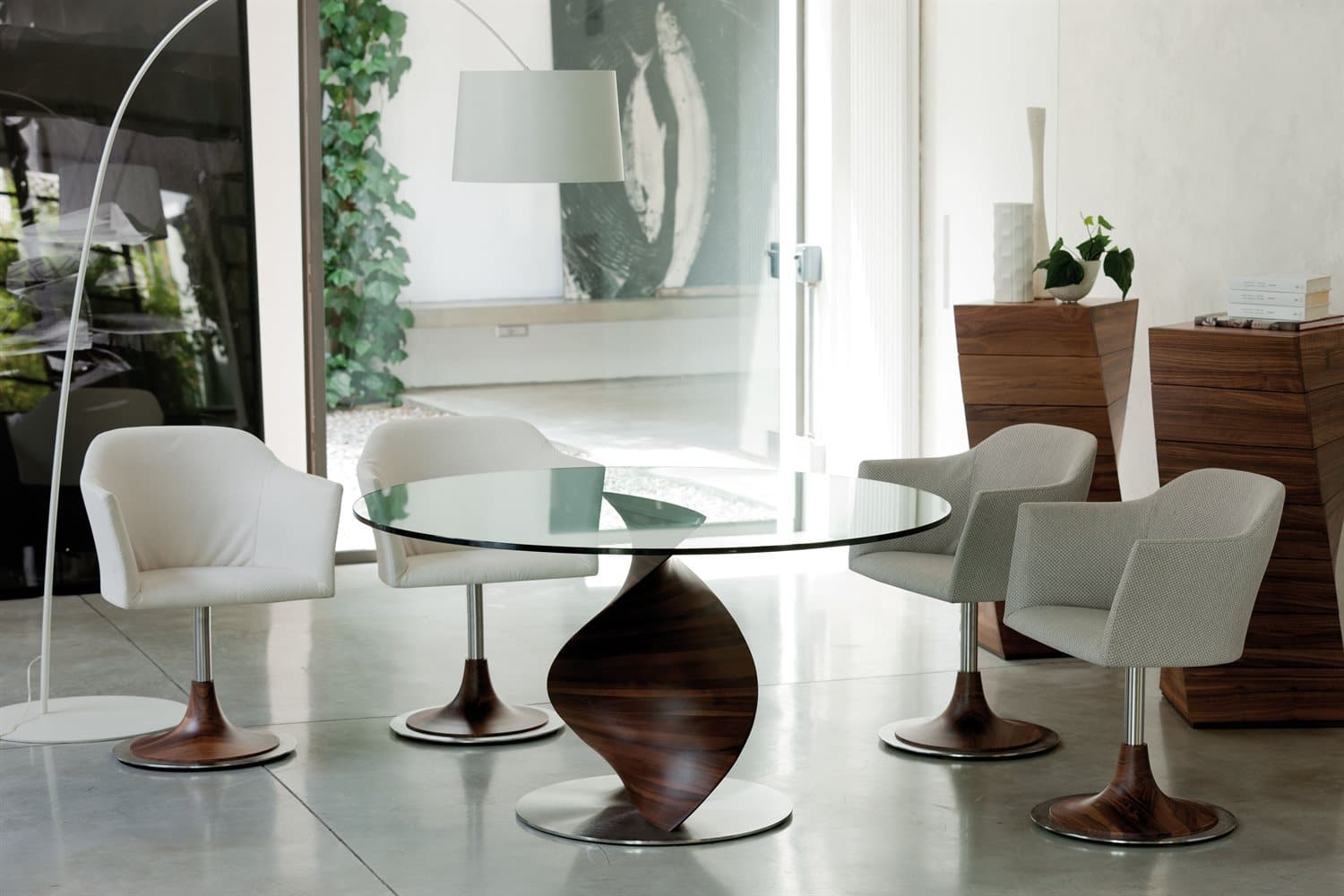 Dining-table with base in solid canaletta walnut or ash fixed on a metal disc and tempered glass top (thickness mm.12).