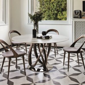 Dining-table with base in solid canaletta walnut or ash fixed on a metal disc and tempered glass top (thickness mm. 12).