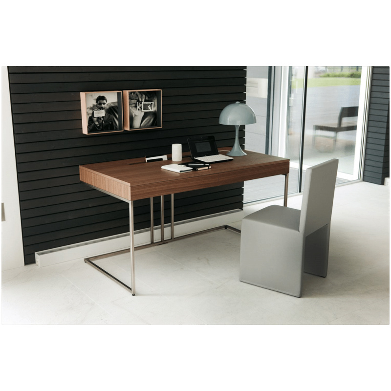 Writing-desk in canaletta walnut with two drawers, a storage for small objects, a hole for cables management and metal base.